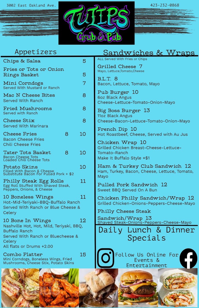 Welcome to Tulips American Grub And Pub, a hidden gem located at 3002 E Oakland Ave, Johnson City, TN. This unassuming bar and grill invites you to unwind with a variety of delectable dishes, each crafted to cater to your cravings. From crispy Cheese Sticks and Fried Mushrooms to hearty Philly Steak Egg Rolls, the appetizer selection is sure to pique your interest.